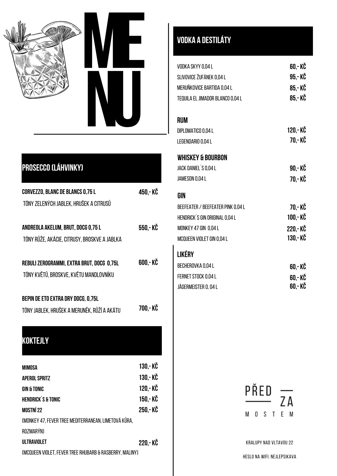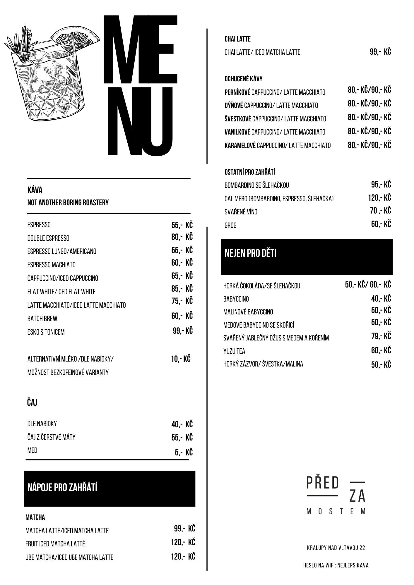 Výběrová káva z pražírny Not another boring roastery, domácí limonády od The Sirup, skvělá vína z menších vinařství z Moravy, italské prosecco, pivo z Budějovic, nebo výborné ginové koktejly. K tomu domácí limonády, čerstvé džusy a mnoho dalšího. U nás si vybere každý.